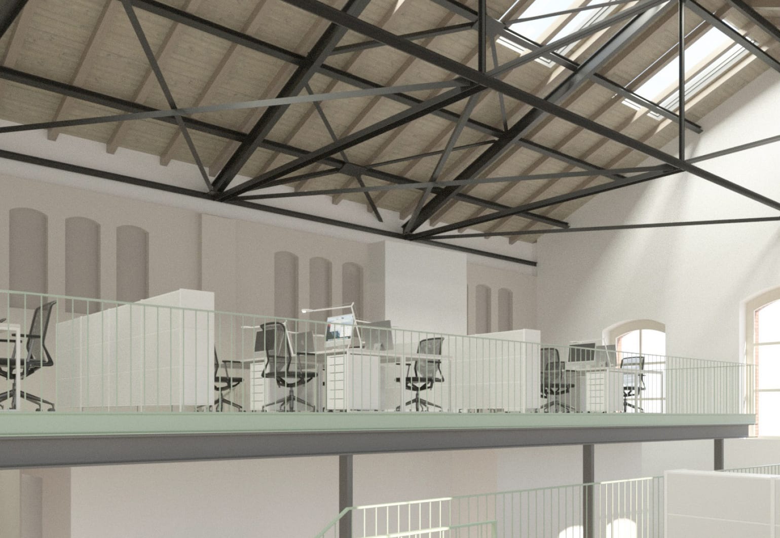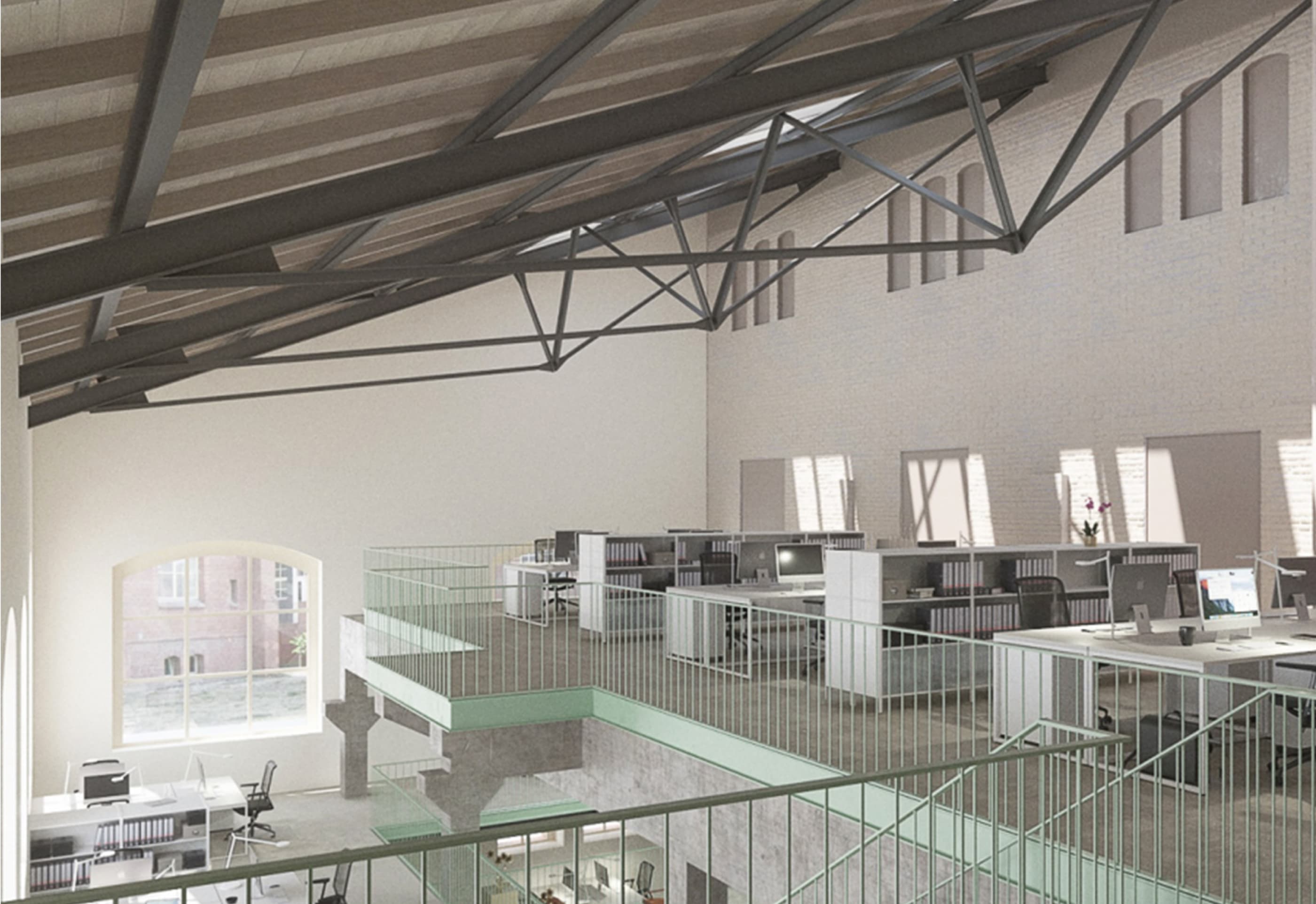 Die Büroflächen erstrecken sich in jedem Mietbereich über mehrere Ebenen, die durch offene Industrietreppen verbunden werden. Die Räume sind bis zu 8 Meter hoch und schaffen so ein absolut unverwechselbares, abwechslungsreiches und kreatives Arbeitsumfeld.